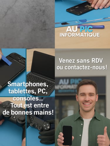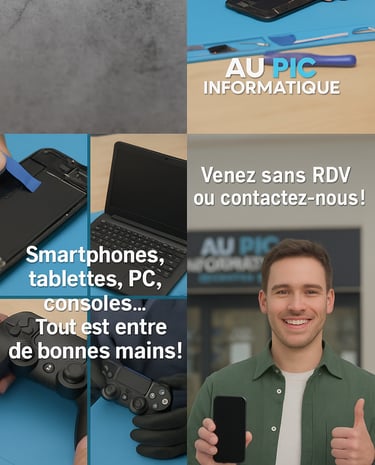 Au Pic Informatique, situé à Saint-Romain-le-Puy (42610), nous sommes fiers d'être réparateur labellisé Captain Repair, symbole de confiance et de qualité dans le domaine de la réparation électronique. Nos techniciens, formés aux dernières techniques, vous assurent des réparations certifiées, réalisées avec un savoir-faire reconnu. Nous mettons un point d’honneur à offrir des tarifs transparents, sans aucune surprise, et nous garantissons chaque réparation pour votre sérénité. En choisissant nos services, vous optez pour une démarche écoresponsable en privilégiant la réparation plutôt que le remplacement, contribuant ainsi à la protection de notre planète. Que ce soit pour des smartphones, des tablettes, ou des ordinateurs portables et fixes, notre équipe est prête à redonner vie à vos appareils !